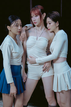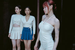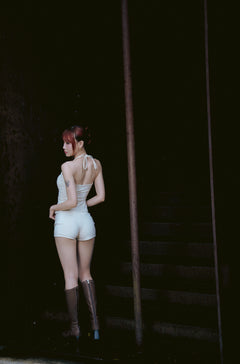 繞頸設計延伸頸部線條,勾勒出俐落優雅的姿態。前胸抽皺細節增添立體層次,修飾胸型並提升視覺集中效果,讓低調性感在細節裡自然展現。